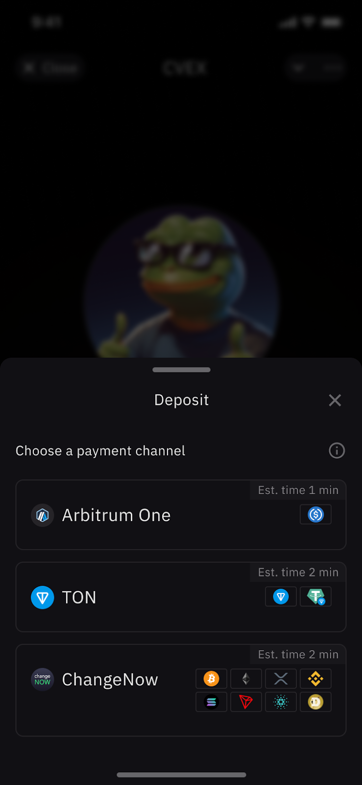 Tap “Deposit” on the Home page. Next, choose your preferred payment method and enter the amount of crypto you’d like to deposit (ChangeNow and TON network) or just copy the address (using Arbitrum One). Whether it’s a stablecoin or any other crypto, we’ve got you covered.