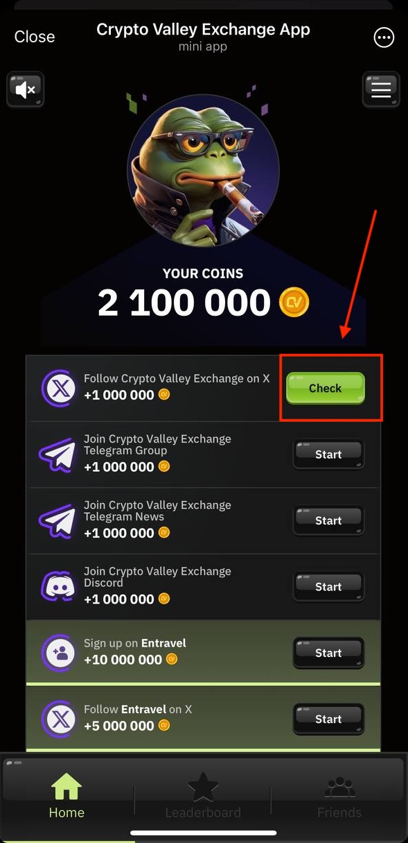 Then, let’s complete some tasks to earn even more. Follow to “Home” page to see available tasks. We’ll pick the first one, “Follow CVEX on X” and do exactly what we were told. To start, click “Start” button: